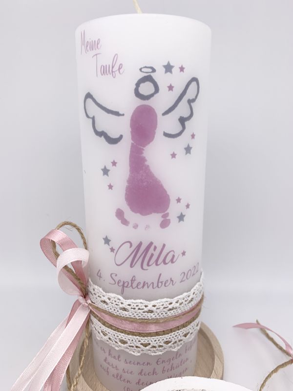 Videos Kerze Engel Fußabdruck rosa mit Vintage Spitzenband + Schleife seitlich aktualisiert